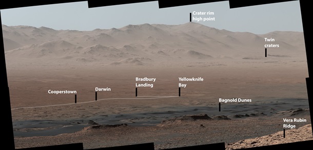 На снимке виден путь Curiosity за пять лет - 18,4 километра от места посадки в место пребывания - на Хребте Веры Рубин. Здесь высокое содержание минерала гематита, который формируется при наличии воды.
