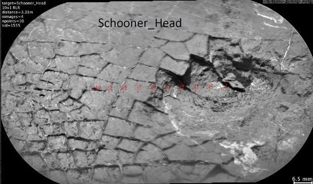 Инструмент ChemCam обнаружил высокие уровни оксида марганца в породах области Кимберли кратера Гейла. Эти данные подтверждают идею, что свободный кислород находился на поверхности Марса в больших количествах в период, когда планета была более теплой, и ее поверхность изобиловала озерами.