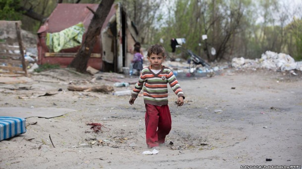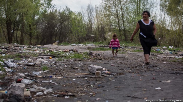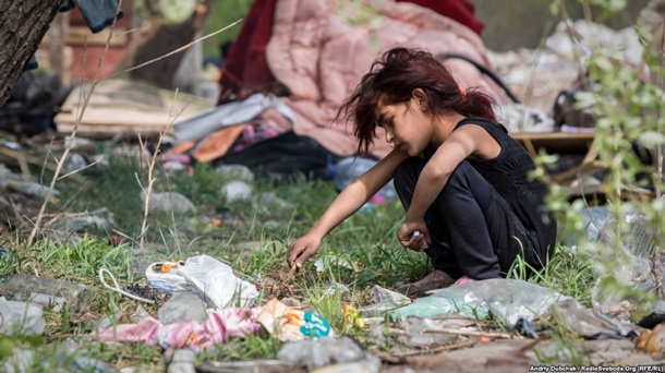 Девочка из стихийного поселения ромов палит костер из целлофановых пакетов