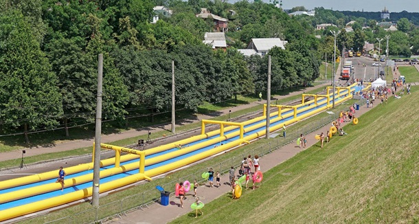 10:00 Открытие самой длинной в Украине водной горки в этнографическом музее Пирогово. Спуск длинной в 300 метров включает в себя две трассы шириной 6 метров.