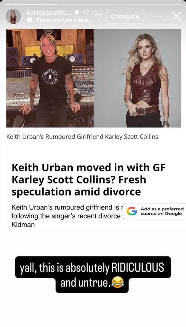 После волны обсуждений сама Карли решила публично отреагировать на эти предположения. В своем Instagram певица опубликовала сториз со скриншотом статьи, где утверждалось, что Урбан переехал к ней после развода. На это она ответила коротко и категорично: "Ребята, это абсолютно бессмысленно и неправда".