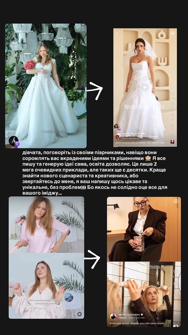 "Девочки, поговорите со своими пиарщиками, зачем они позорят вас украденными идеями и решениями?" — написала актриса в сториз.