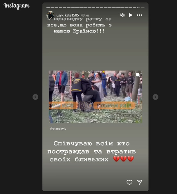 "Я ненавижу рашку за все, что она делает с нашей страной. Сочувствую всем, кто пострадал и потерял своих близких", - написала Усик в своем Instagram.