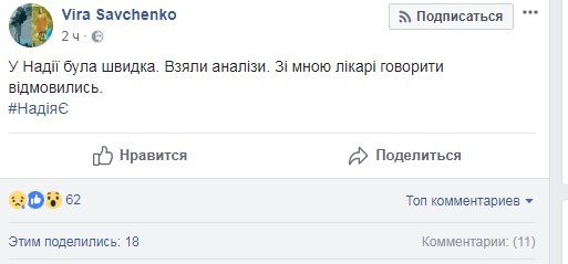 - У Надежды Савченко, которая находится под арестом, врачи скорой помощи взяли анализы, сообщила сестра дапутата.