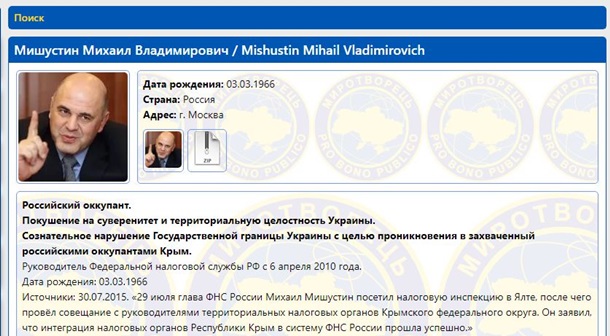 Кандидат на пост премьер-министра России Михаил Мишустин внесен в базу скандального сайта Миротворец.