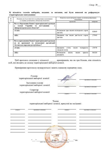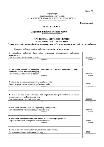 Согласно протоколу окружной избирательной комиссии, только в 106-м избирательном округе Луганской области 83 849 человек проголосовали за сохранение территориальной общины в составе Украины и соединение с Днепропетровской областью.