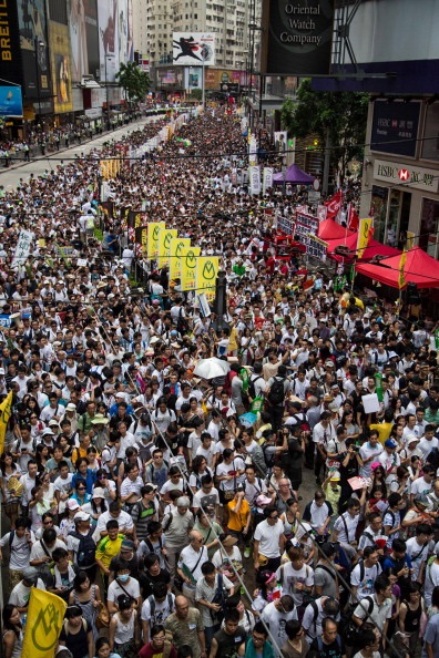 Гонконг отмечает 17-ю годовщину перехода бывшего британского анклава под китайскую юрисдикцию. Представители оппозиции во второй половине дня, как и обещали, созвали многотысячный марш протеста с требованиями демократизации избирательной системы. Организаторы акции планировали, что она станет крупнейшей за последние годы и соберет полмиллиона человек. Судя по фото, цель достигнута.