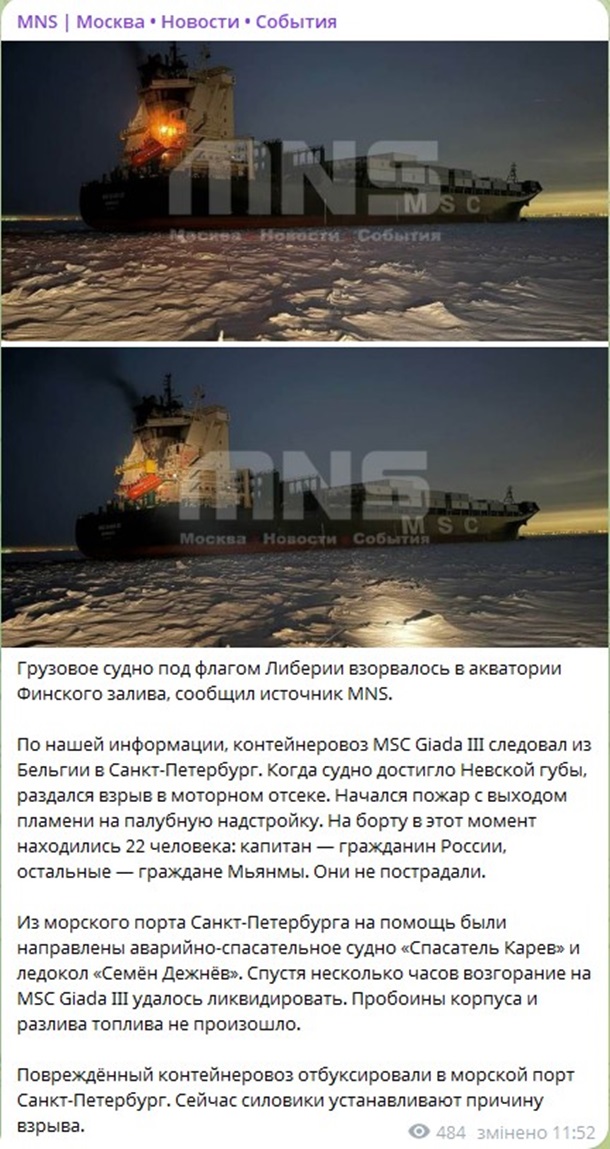 Взрыв произошел в акватории Финского залива на грузовом судне, идущем под флагом Либерии. Контейнеровоз MSC Giada III направлялся из Бельгии в Санкт-Петербург. Об этом в четверг, 5 февраля, сообщает российский провластный новостной портал MNS, ссылаясь на свой источник.